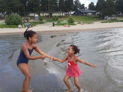 Sommarens bästa dag. Soligt och varmt hela dagen och till och med hela kvällen. Vi har varit i vår stuga och njutit av vädret. Barnen har badat. Kvällen åkte vi in till stan till några vänner. Barnen vill bo så här. Grannar, barn som springer mellan och umgås, badar och fikar.